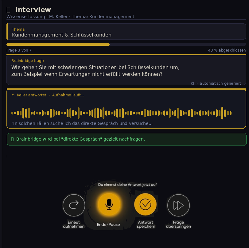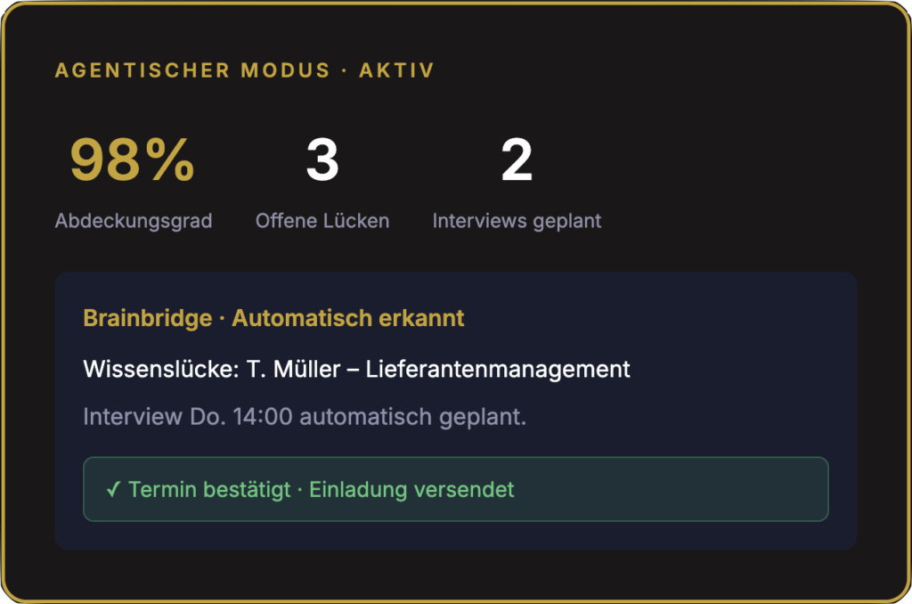 Brainbridge analysiert Ihre Wissensbasis kontinuierlich, erkennt Lücken eigenständig und schließt sie automatisch, indem es gezielt Mitarbeitende zu Interviews einlädt und die passenden Fragen selbst entwickelt.