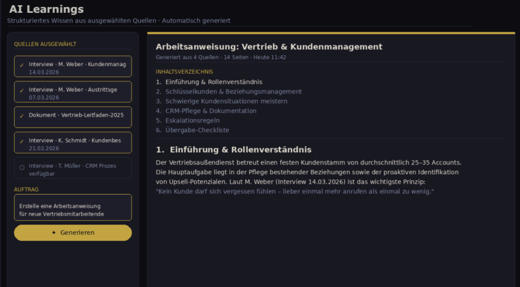 Quellen auswählen, Auftrag formulieren, fertig. Brainbridge bündelt Interviews und Dokumente nach Wahl und erstellt daraus ein tiefes, strukturiertes Dokument, zum Beispiel eine Arbeitsanweisung oder ein Onboarding-Handbuch.