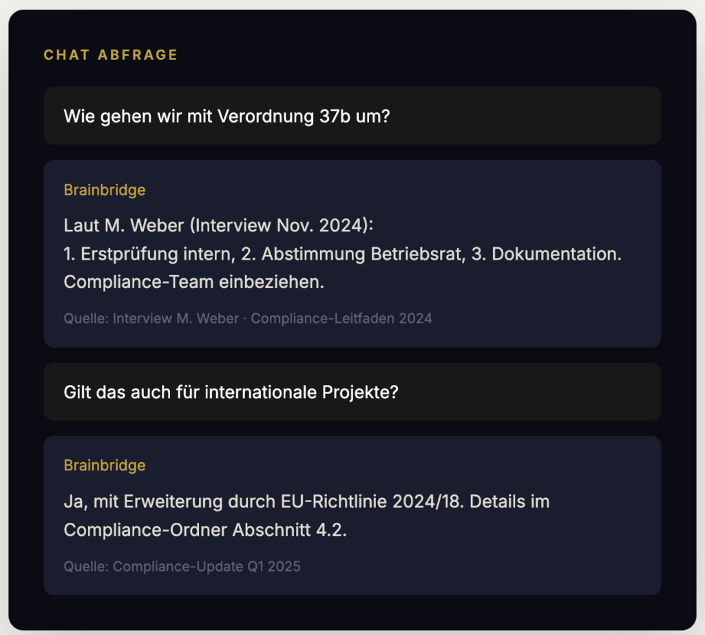 Ob schnelle Antwort, strukturiertes Lerndokument oder Wissensexport. Brainbridge macht Ihr Unternehmenswissen zugänglich, wann immer es gebraucht wird.