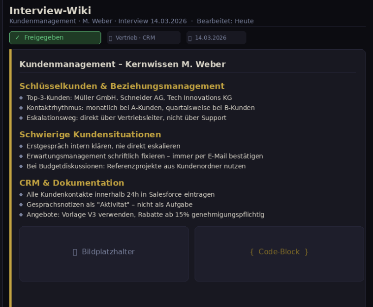 Nach jedem Interview entsteht automatisch eine strukturierte Zusammenfassung. Sie kann sofort bearbeitet, mit Bildern und Code ergänzt und versioniert gespeichert werden.